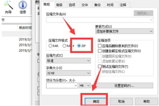 3、在弹出的窗口中选择“ZIP”格式,然后点击“确定”按钮,窗口关闭后在点击上层窗口上的“确定”按钮: